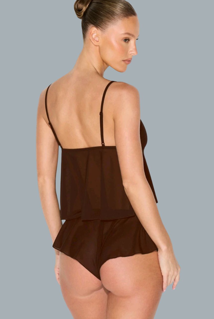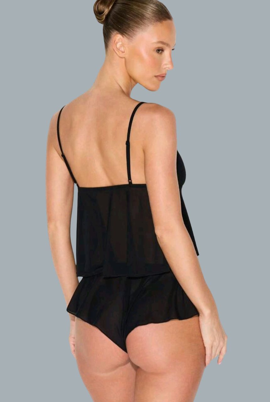 Diseño con tirantes finos y shorts con volantes que aportan un aire femenino, romántico y elegante.