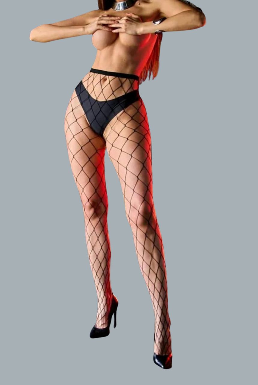 La malla amplia crea un contraste visual moderno que resalta la piel con un aire atrevido pero elegante.