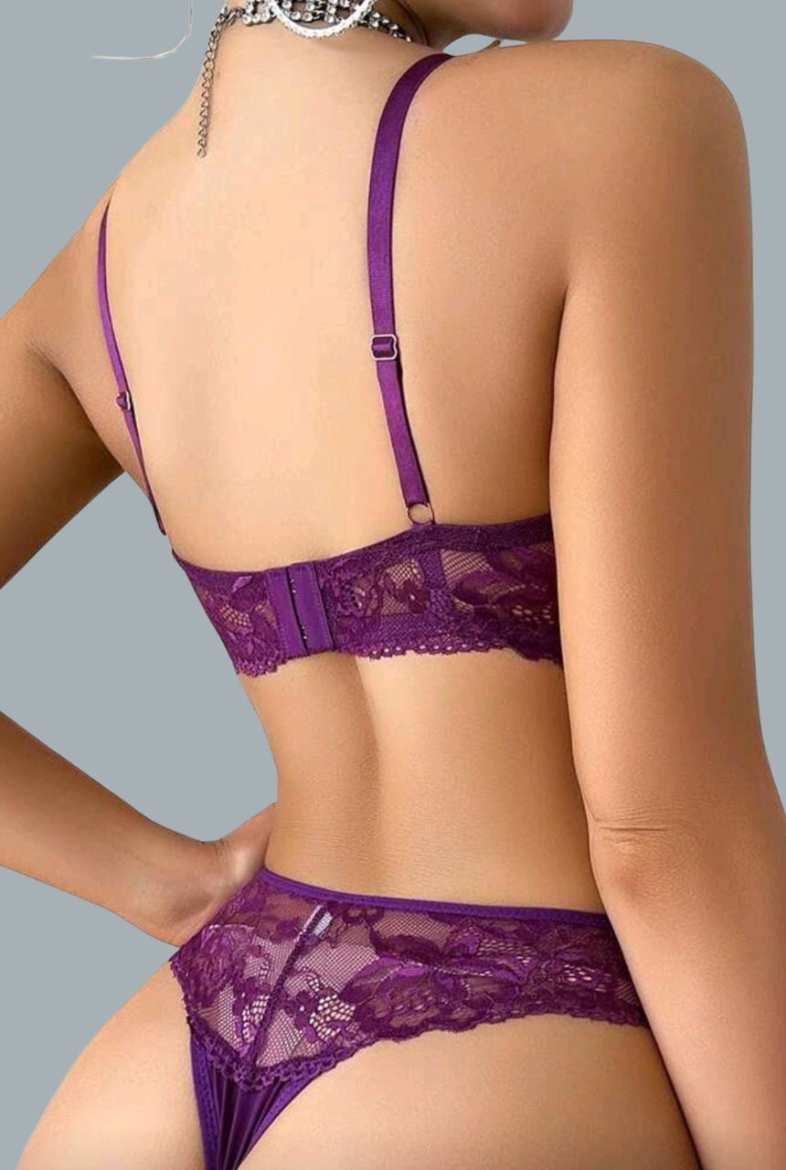 Set de brasier y tanga con detalles delicados de encaje floral. El brasier realza naturalmente el busto con un ajuste cómodo y soporte perfecto, la tanga de corte fino resalta la silueta con sutileza y elegancia.